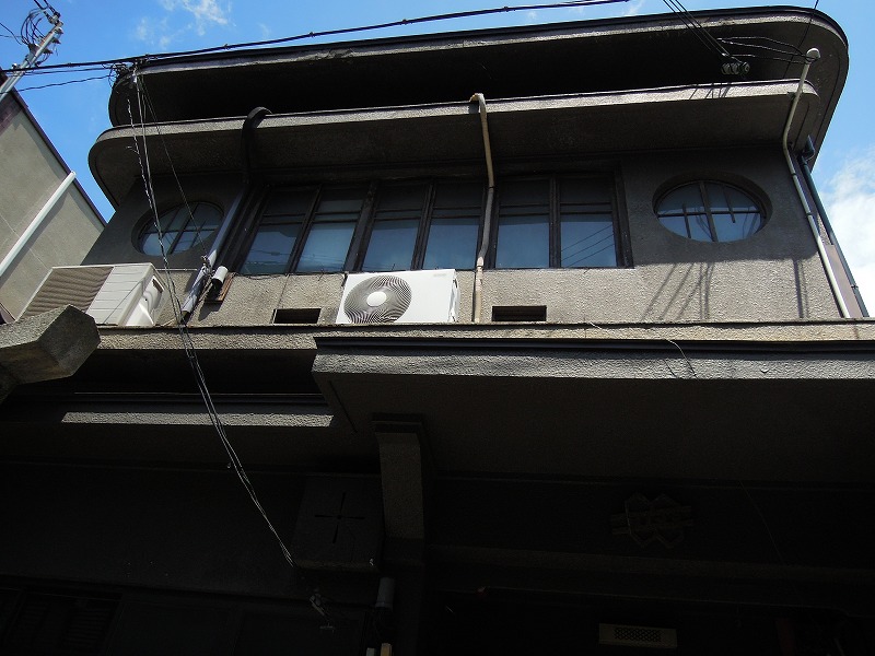 薬祖神祠について。二条通を室町通から東に入ったところに、両側を建物にはさまれるようにして立つ鳥居が見えます。お隣の建物もレトロで素敵。