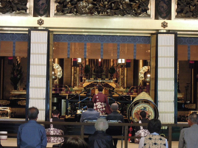 御坊さんが普段着用の袈裟(五条袈裟)を着てお経を詠んではりました。お経ってここちよいリズムです。笙と太鼓が心地よさをアップさせてくれます。