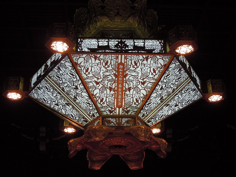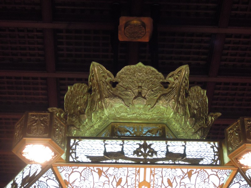 お堂の照明の美しい事。ものすごく大きいんですよ。ブドウの蔓に南洋のオウムかしら?鳥さんが遊んでいます。