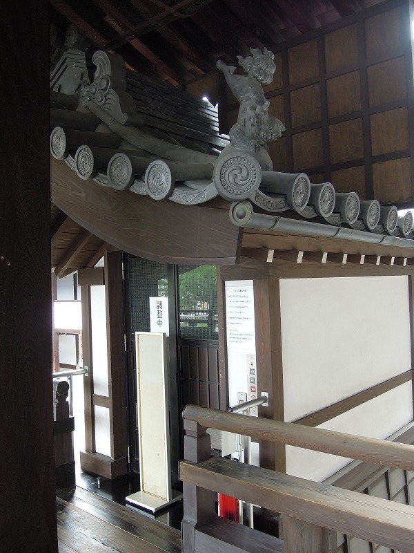 時代を反映してエレベーターがあります。ちゃんと瓦屋根。屋根瓦で狛犬が曲芸中。