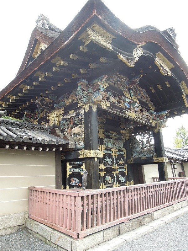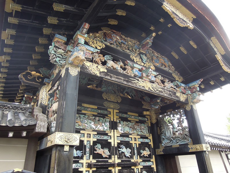 絢爛豪華。檜皮葺き(ひわだぶき)・唐破風(からはふ)の四脚門(しきゃくもん)です。彫刻の見事さに日の暮れるのを忘れることから”日暮らし門”とも呼ばれているそうです。