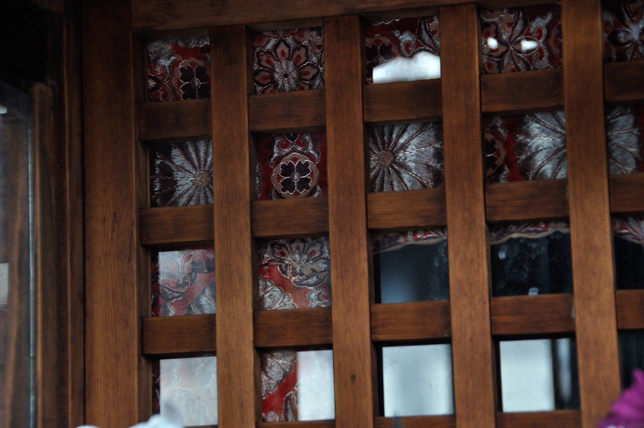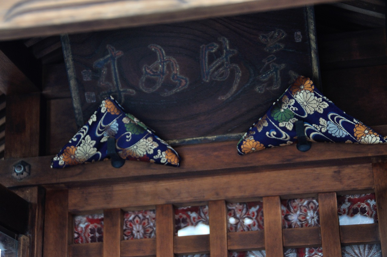 扁額の三角座布団が紺地の菊花流水の金襴地。扁額になんと書かれているのか・・・。読める方、是非ご教授を。