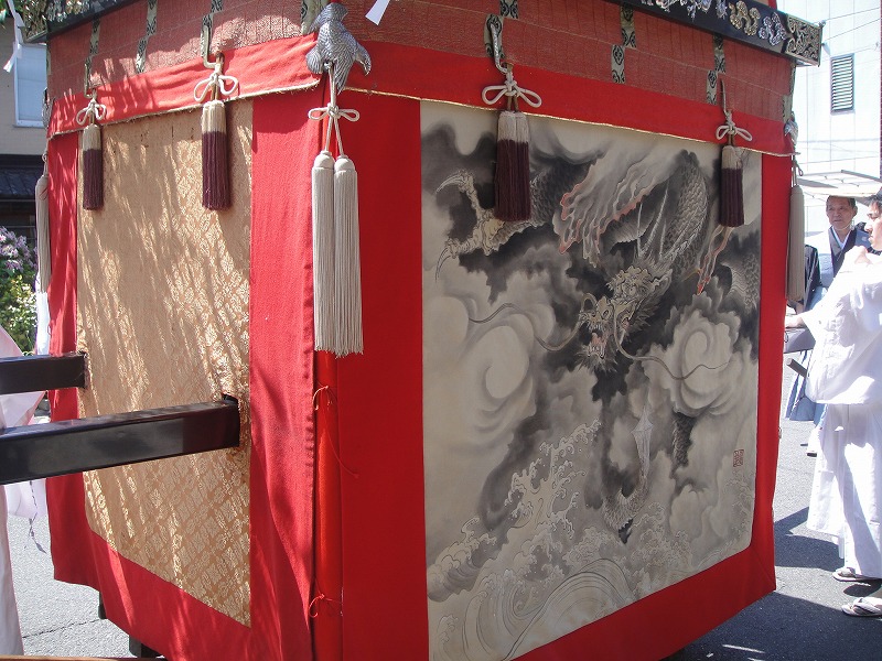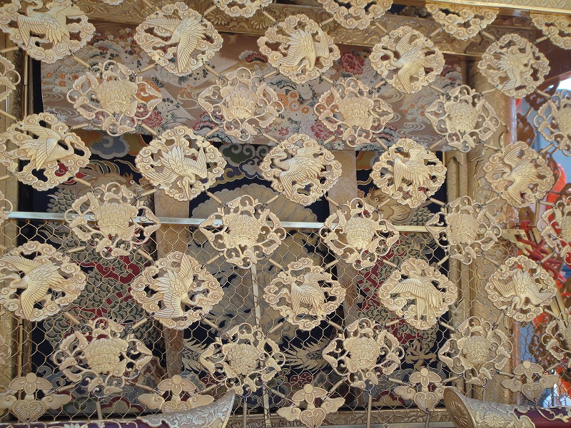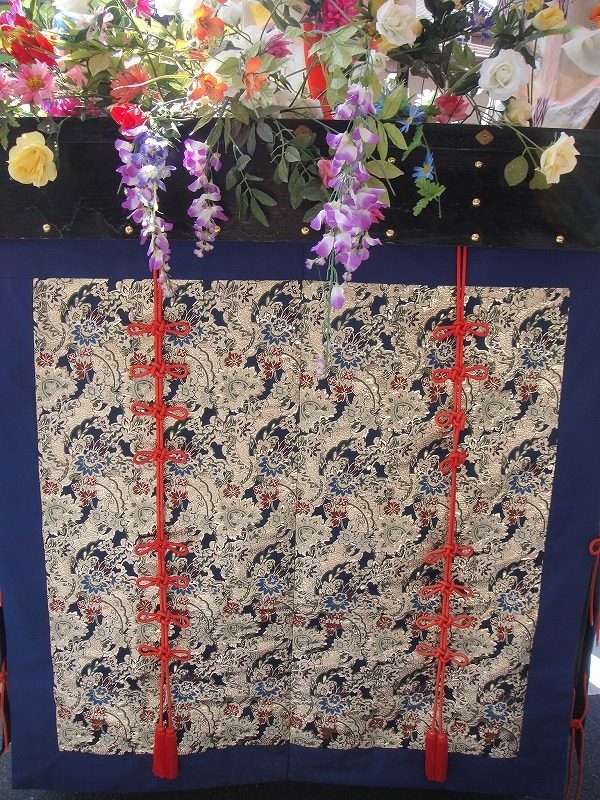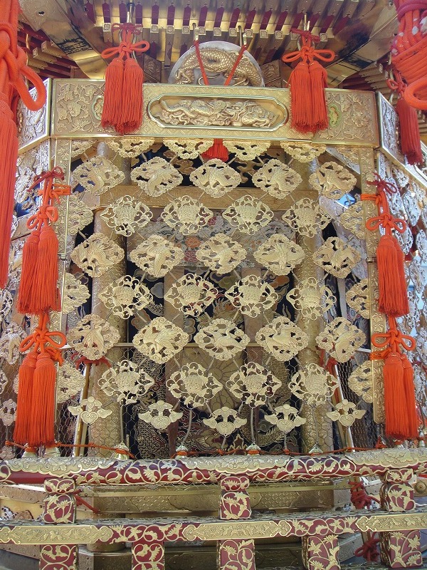 上の写真は祇園祭で有名な「鉾」の原型といわれています。西陣ですもの。周りの懸想品も堂々たる西陣織です。鉾も美しいですね。
