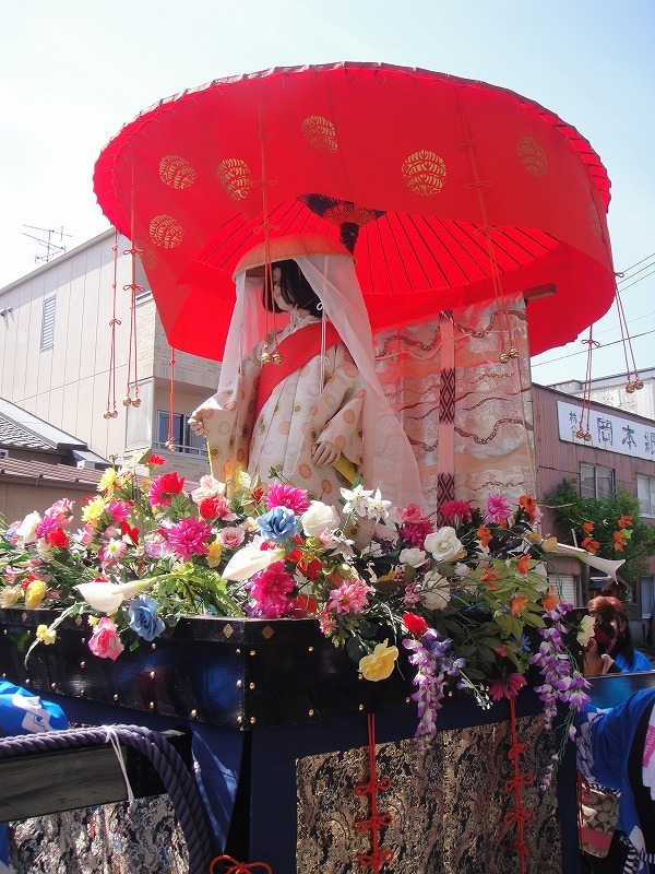 下の画像が西陣の地を愛した「お玉さん」をイメージし装飾した「玉の輿」。たぶん学生さんたちの「YOSAKOI」を普段は踊ってはりそうな方たちが担いではりました。