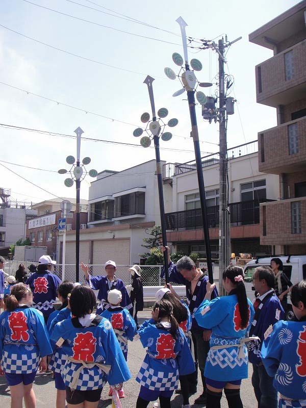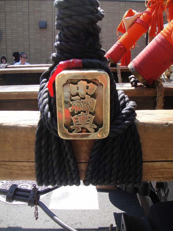 これらはお子達鉾。かわいいんです。小学生達が一生懸命お腹につけた「鉾固定器具」に鉾を乗せて「チャリン、チャリン」という鈴の音を響かせながら上の鉾がピランピランと動きます。