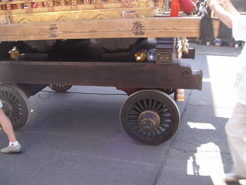 この車輪が御所車。「ギーーーギーーーッ」ときしむ音。人の乗れる牛車だったら通常は4人乗りだったそうなので大きいし、そのきしみ音たるやすごかったんでしょうね。