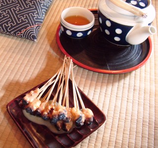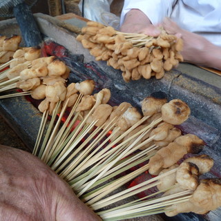 今宮さんの名物は・・・あぶり餅。竹串に小さく付いた御餅がこんがりと炭で焼かれて一皿15串です。白味噌の餡がなんとも言えず美味しいので御来京の際は紫野まで足を伸ばして、西陣一帯の氏神さんのお参りをどうぞ。
