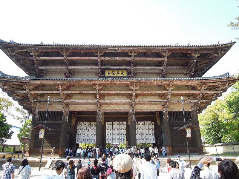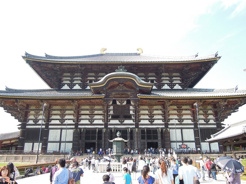 大仏殿は国内の戦争のために二度も焼失していて、今の建物は江戸時代に立て直された三度目のものです。最初と二度目のものと比べると約三分の二の大きさですが、それでも世界で一番大きな木造の建物です。大仏様のお顔や両手などは火災のたびに作り直されたものですが1250年前に大仏様を作った人々の心は、たびたびの修理のお陰で今に伝わっているので。世界最大の銅像でもある「奈良の大仏さま」は世界中の人たちから大切にされ、親しみを持って拝まれています。