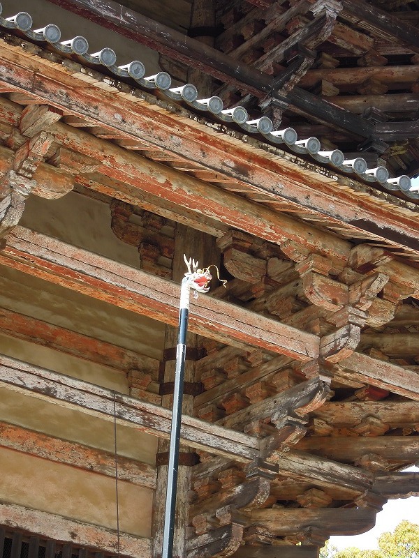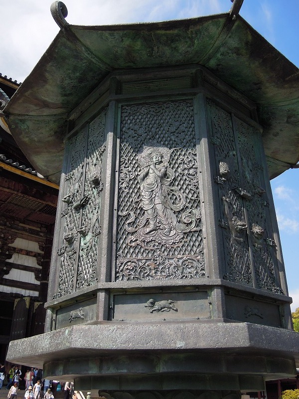 小さく見える金銅八角燈籠。かんぬきが見えるので厨子かと思いました。国宝です。たびたび修理されていますが、基本的には奈良時代の創建時のものです。4面には楽器を奏する音声菩薩(おんじょうぼさつ)像が見られます。