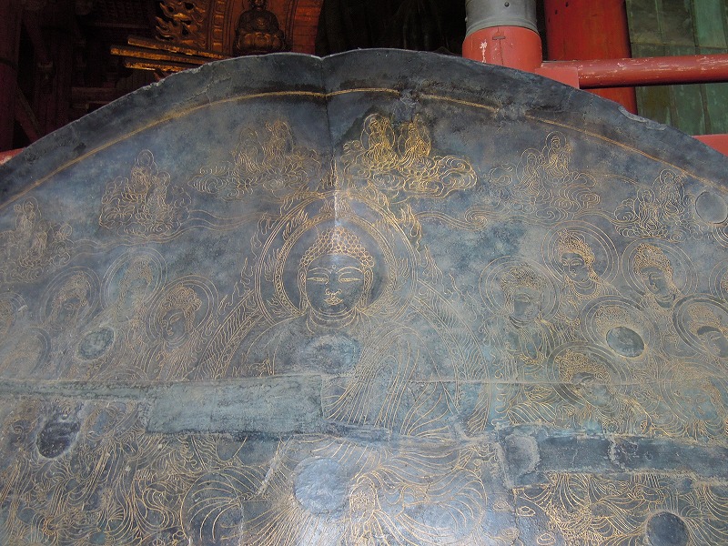 大仏さま、すなわち盧舎那仏の座っておられる蓮台の周りの蓮弁に、いずれも同じ図柄の絵が毛彫りで描かれています。