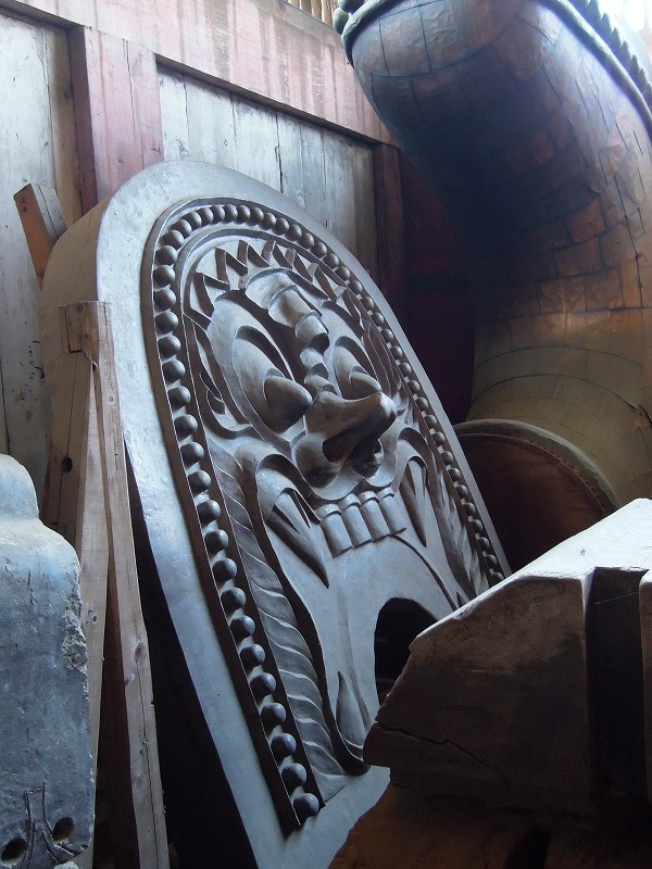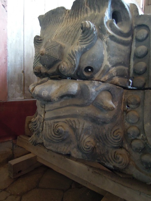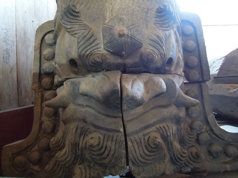 本堂の片隅に昔の鬼瓦やしゃちほこがありました。大きい!「大きい」という言葉を繰り返し繰り返し書いていますが、大きいんです!!