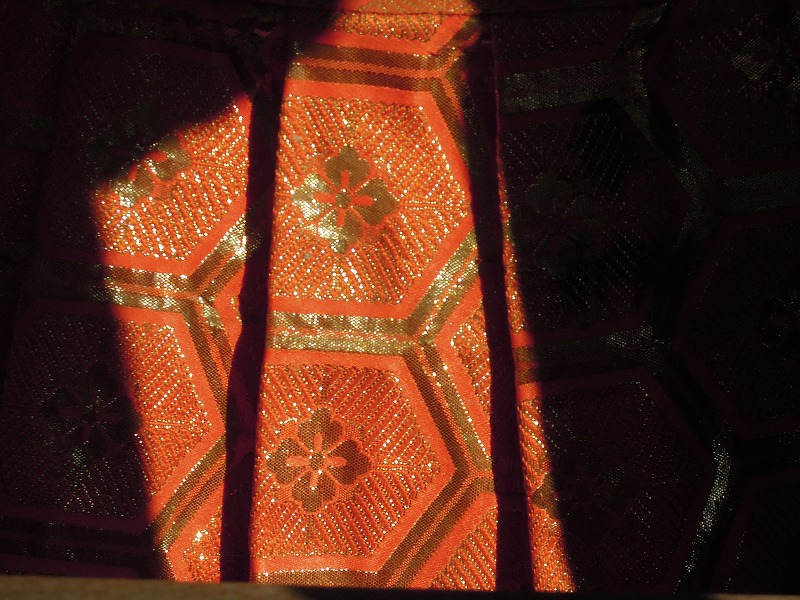 場所柄、西陣織だと思います。朱地に箔で亀甲が織られています。金襴発見!
