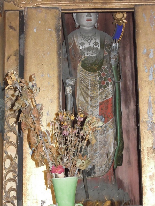 立派な地蔵菩薩が安置されています。瓔珞(ようらくと言い金属片をつなげたきらびやかな飾り)の胸飾りをつけてはる、しかし宝珠を持っているかどうか確認できず。左手に宝珠を持っていそう。少々豪華な袈裟を身につけてはりますが雲水行の様子にも見えます。