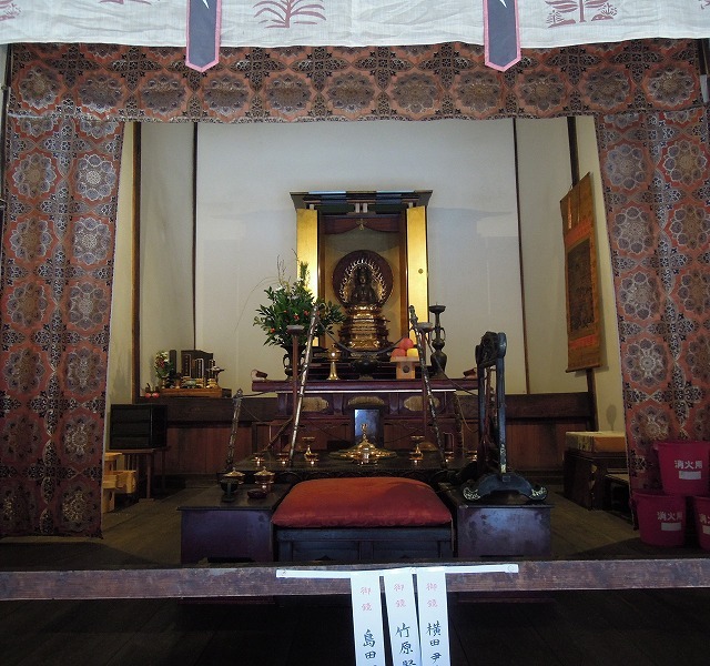 神社の本殿には地味ですが金襴が使われています。御簾や幡。