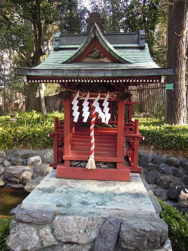 祠がありましたよ。昔「十二社の池」と呼ばれる灌漑用の池が大小あったそうなのですがそれをしのんだ池なのかな。現在のこの池の中にある祠には弁財天が祀られています。