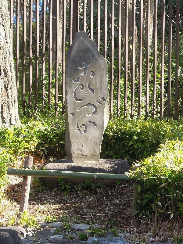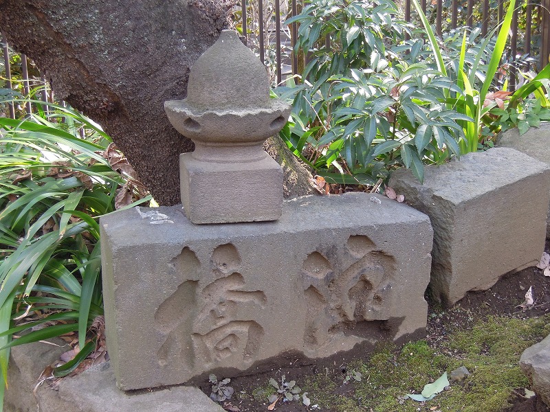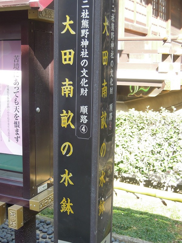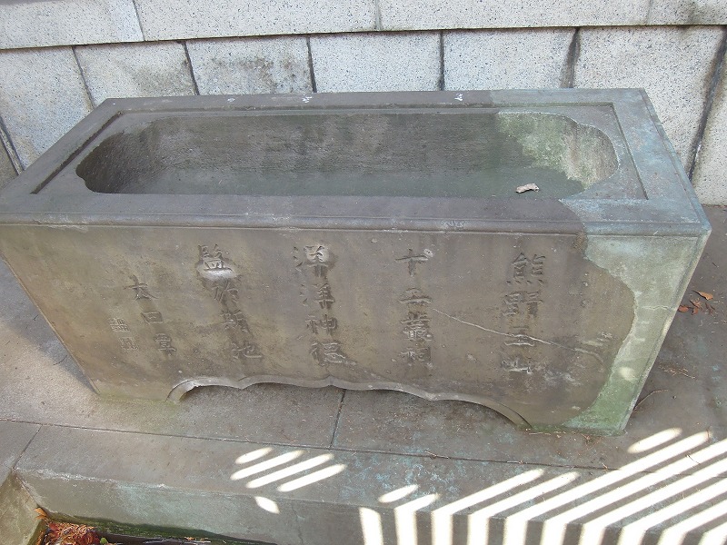 新宿区指定有形文化財(工芸品)で文政3年(1820年)に奉納された水鉢。狂歌師、大田南畝((おおた なんぽ)勘定所幕吏として支配勘定にまでなった一方、趣味で狂歌集や洒落本などを著しました。唐衣橘洲(からころもきっしゅう)・朱楽菅江(あけらかんこう)と共に狂歌三大家と言われる。)の書による銘文があります。