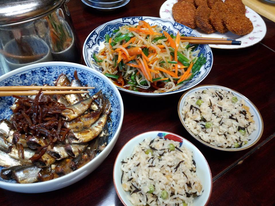 今日の織屋の賄いは、ヒジキ豆ご飯、コロッケ、もやしと人参、にらのお浸し、鰯の生姜煮でした。