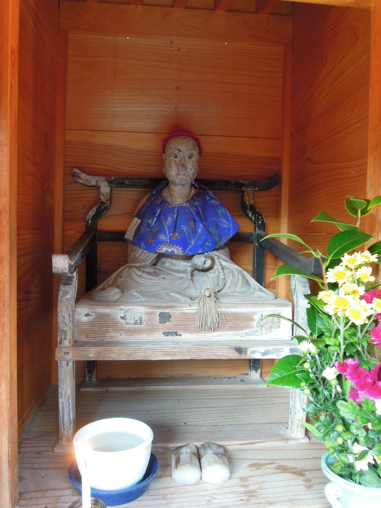 お地蔵さんのおべべにも金襴地。ずいぶんと大柄の紋様ですね。ひまわり・・・?帯地かしら。いや、帯にしては柄が大きいような・・・。赤い帽子の可愛いお地蔵さんです。目が黒くて地蔵菩薩というよりびんずるさんぽいです。お履物も脱いで椅子に腰掛けてはりますね。