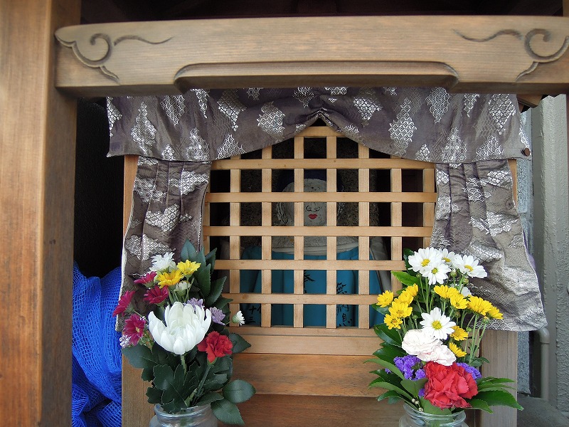 朱の唇のお地蔵さんがちらっと見えます。ん?ここはたぶんごみ集積所なんでしょうね。カラス&猫防止の網が見えます。お地蔵さんも受難な時代ですね。