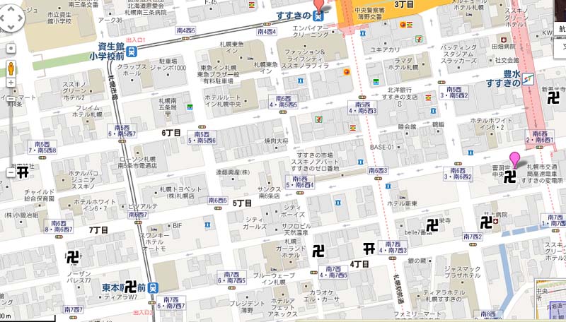 お寺と神社マークをがんばって載せてみました。すすきのの中央部を囲むように神社仏閣が建っています。なんとなく色々な想像をしてしまいます。結界の意味もあったのかしら。