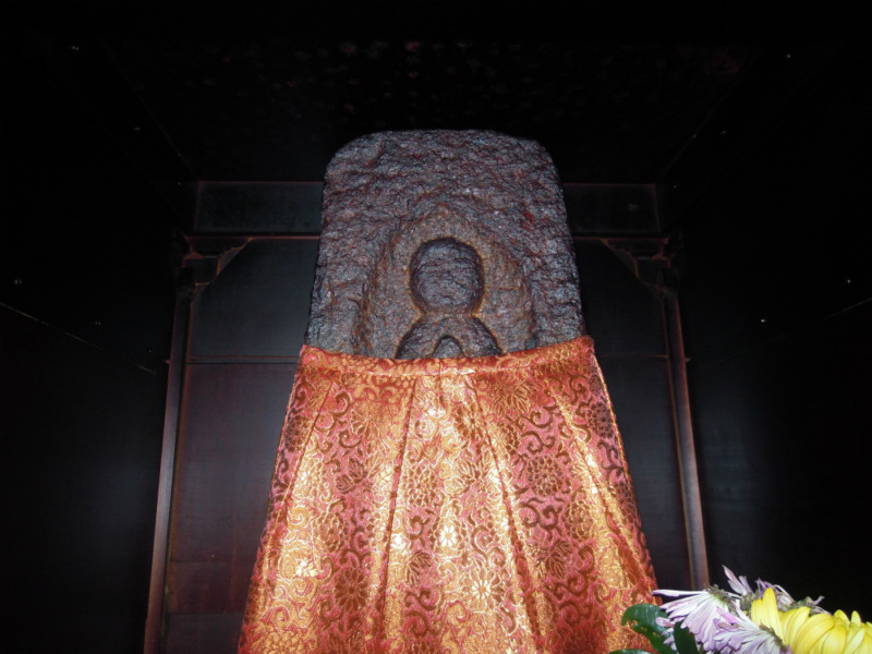 赤味がかった石に彫られたお地蔵さん。宝珠を抱いております。土の中から出土したと言う事なので長年、土に守られて磨耗は避けられてきたのか、それとも土の中でもまれたのか?そこら辺は私には解りませんが戦乱の悲しみを癒すためのお地蔵さんだったと聞いたらなんともいえない気持ちになります。
