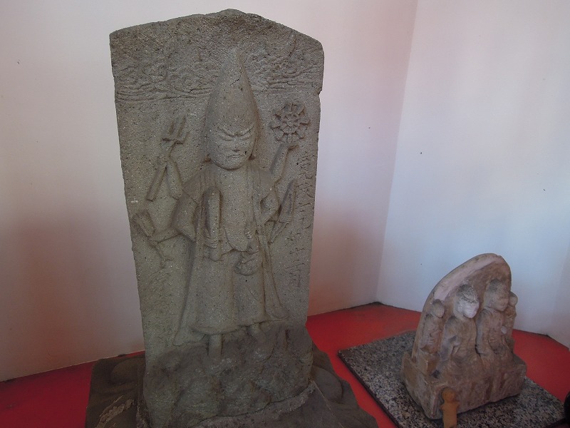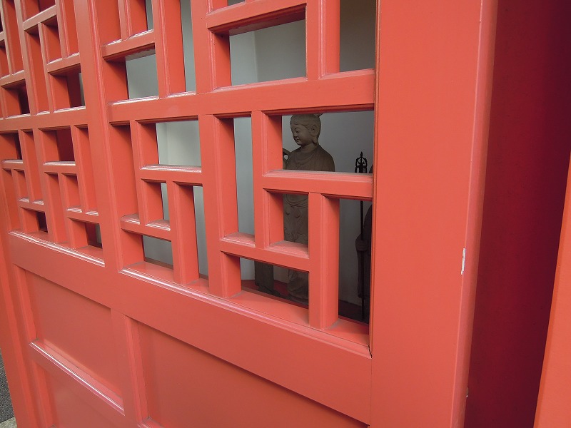両の門の中にはとても可愛いギャラリーのように仏像が安置されています。六臂の明王様かしら。御所車に、弓、銛?三銛杵かな。勺。あとの二つはわからない・・・。