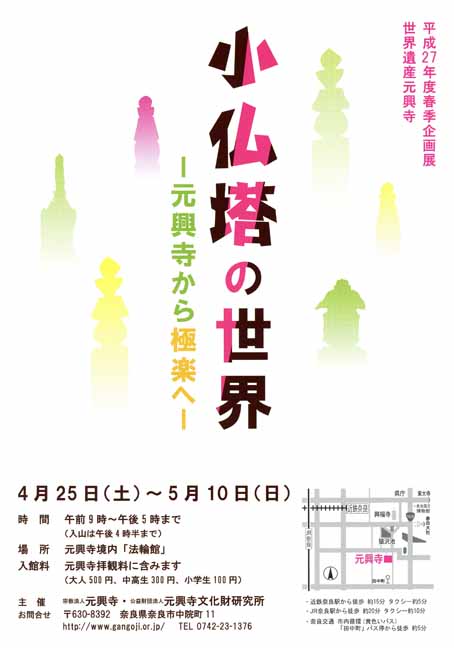 元興寺には「元興寺文化財研究所民俗文化財保存会」という元興寺などに保存してあったり出土したりする歴史的遺産を保存して調べるという機関があります。元興寺境内「法輪館」(総合収蔵庫) でその成果を展示したりしてはるのですが春季企画展として「小仏塔の世界 -元興寺から極楽へ-」という展示をしてはりました。