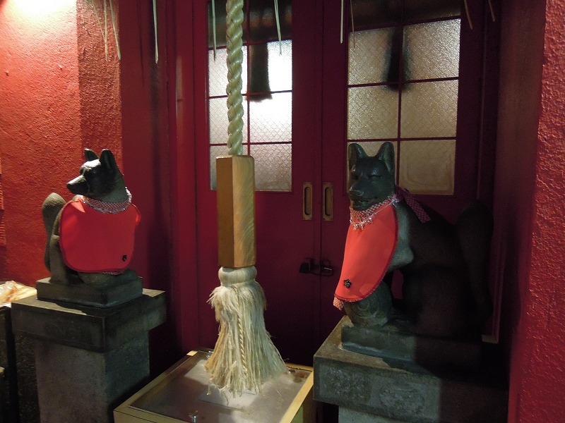 何せ日本を代表する高価格な地価の土地の事ですから鳥居を建てるのも一苦労。しかし朱塗りの鳥居の威厳は保ちたい。と言う事で壁一面朱色になったのではないでしょうか。こういうのも素敵ですね。ちょっと廓を髣髴させます。見たことないですが。