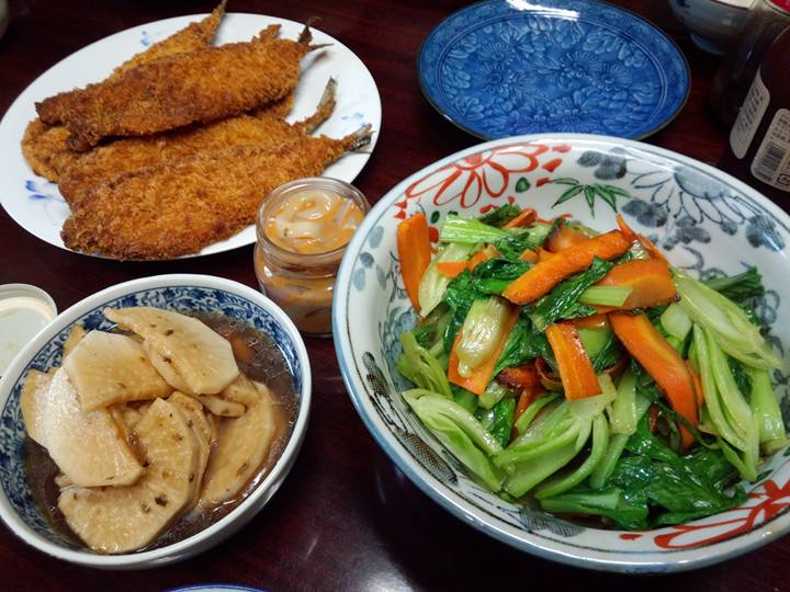 今日の賄いは、さんまのフライ。一人2尾づつの予定。多いでしょうか?青梗菜の炒めたん。大根の漬物等々でした。実山椒多めで塩辛漬けました。