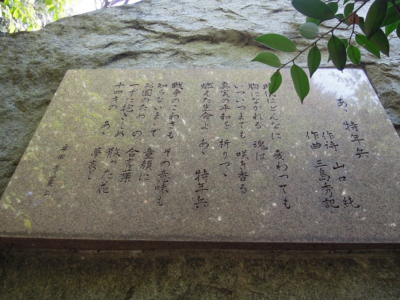 吾々は 今は還らぬ幼い戦友の霊を慰め 永遠に安らぎ鎮まらむことを願うと共に 特年兵を顕彰し その真心と功績を後世に伝え祖国繁栄世界平和を祈願しながら尽力することをこゝに誓う