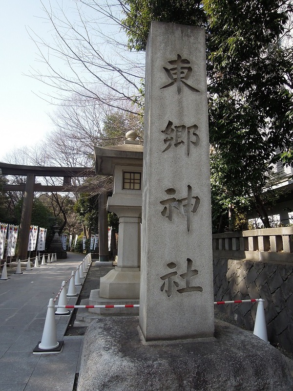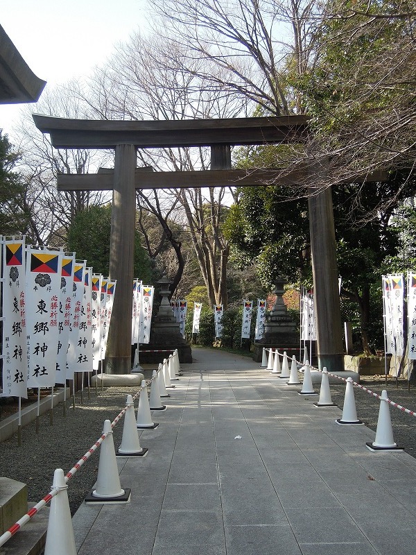 しばらく歩くと東郷神社の入り口です。残念ながら平日なので「能美の市」はやってません。ここの通りはマリオンクレープがあるのでクレープの匂いが香ります。