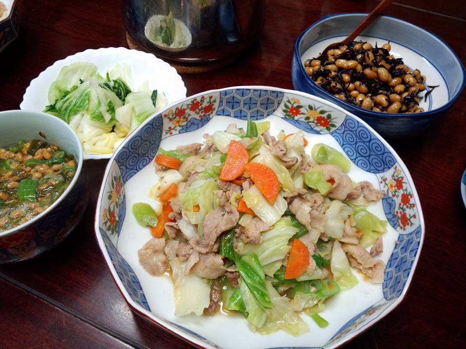 今日の織屋の賄いは、肉野菜炒めでした。納豆にはメカブを入れて。