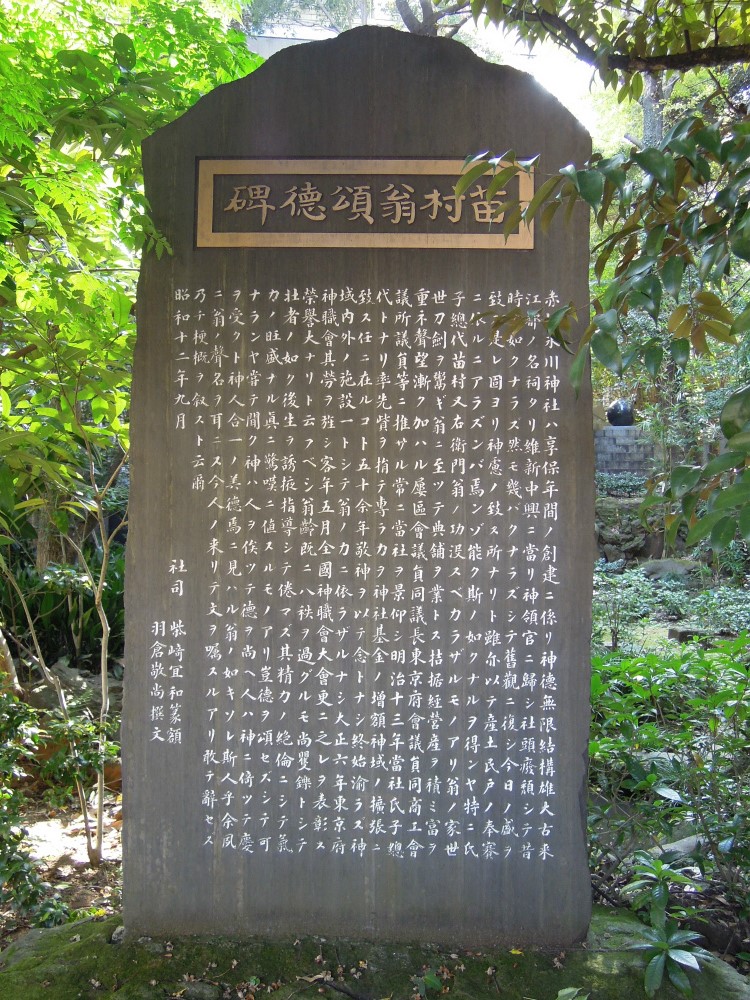 苗村翁頌徳碑。苗村翁さんとは「苗村又右衛門」という方で明治、大正の氏子総代で区会議員、府会議員も勤めた方だそう。江戸から明治にかけて神社などは苦労したと思いますが氷川神社もさにあらず、その再興に尽力された方の碑だそうです。