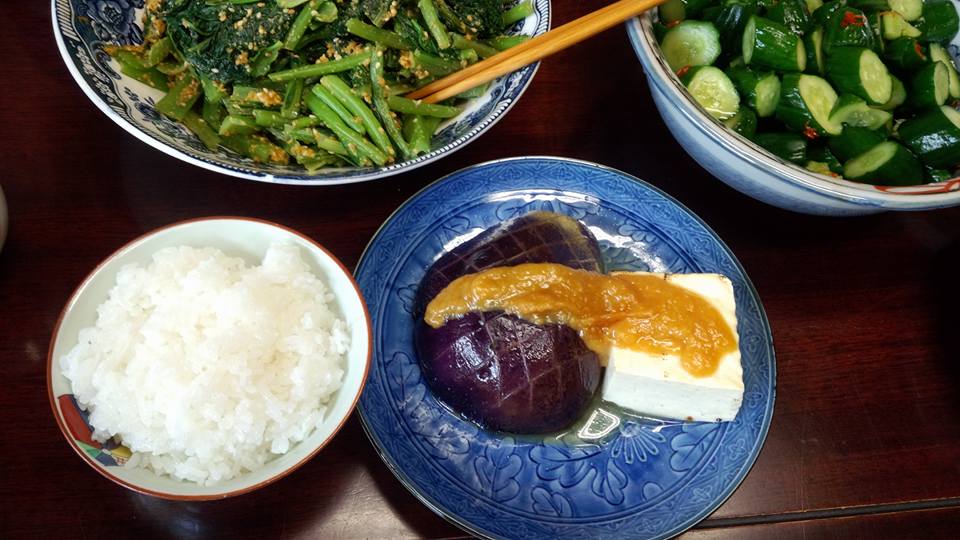 今日の金襴織屋の賄いは、賀茂なすと豆腐の田楽、小松菜