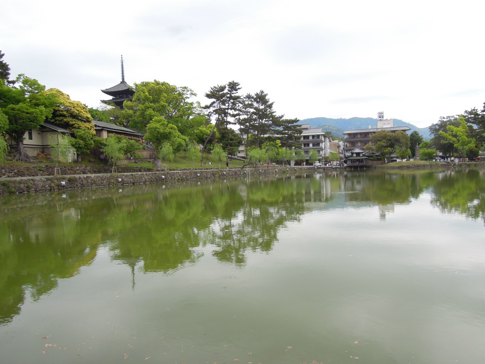 興福寺の放生会の為に作られた猿沢の池。美しい。向こうに見える興福寺の五重塔。