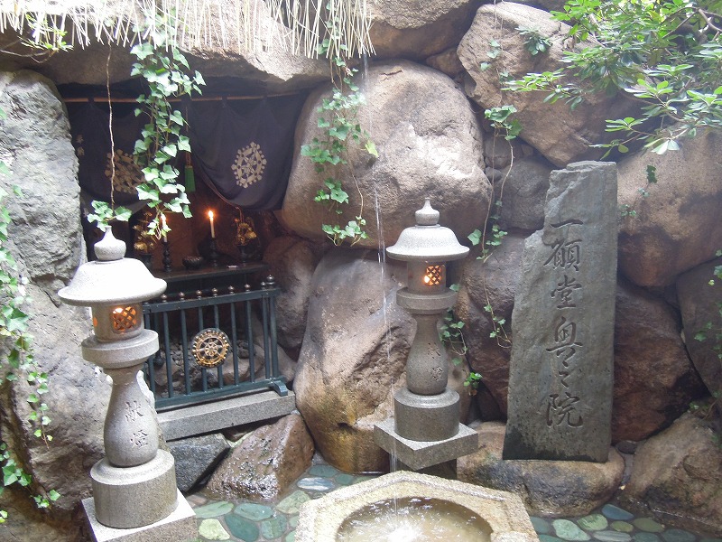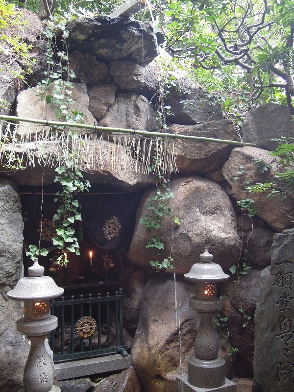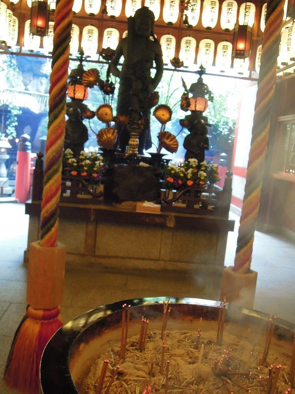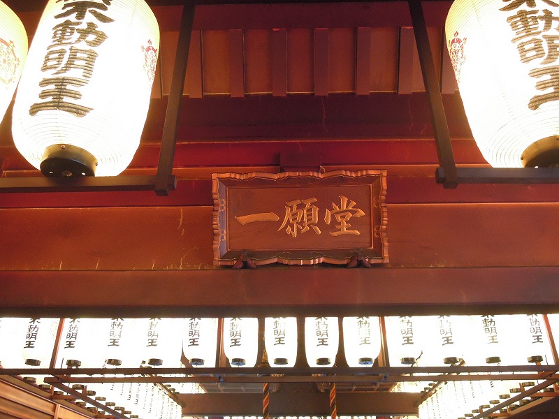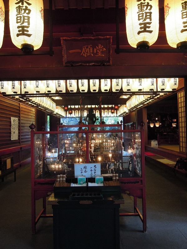 写真では現せていませんが、お線香のうす曇と提灯の明かりの中、外の滝側からの光の逆光のお不動さんはなんともいえない艶がありました。素敵です。こちらのお不動さんは「一願堂のお不動さん」として有名で、お願いを一つかなえてくれるそうです。このおお不動さんの前にいはった初代のお不動さんは第二次世界大戦の大阪大空襲で焼け落ちてしまい(1615年大阪城落城の時にも全焼してはるそうです)、お寺の瓦礫の中に横たわっていたものを現在は秘仏として奥の院(判りませんでしたが洞窟があるそうです)に安置されていはるそうです。今でも、願いを叶えようと訪れる人が後を絶ちません。私が行った時もたくさんの人がお参りに参ってはりましたが多数、というか、99パーセントは女性でした。どうも女性がお参りすると霊験あらたかだそうです。