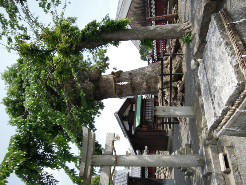 巨木がありました。楠ってほんまに各地で巨木としてすばらしい樹形を見せてくれます。こちらのご神木は幹周り5m強、樹高25m、樹齢は200年くらいらしいです。素晴らしい。上の方の枝は一度ばっさり切った気配です。関西では楠の巨木はよう見ます。気候風土にあってるんでしょうね。根のところとかまるで歩き出しそう!