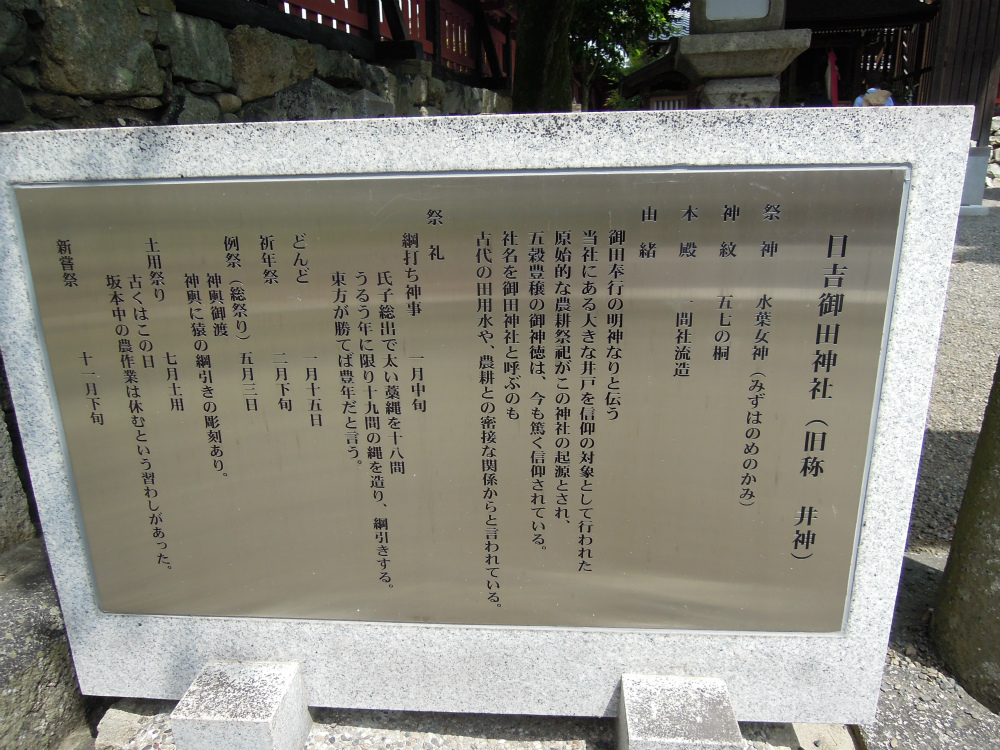 井戸の神、灌漑用水の神、水の神一般として信仰されていて、日照り、大水の時に御利益があるとされています。神社の名前も「御田」ですから瑞穂の国、滋賀県の神社ですねえ。