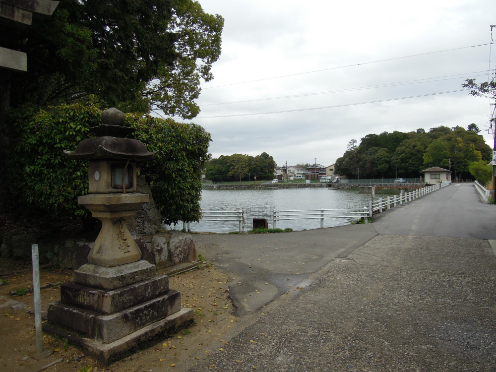 池がすぐそばにあります。この池の名前は「御前池」。この池を挟んで反対側(東側)にも佐紀神社があるそうですが、行けませんでした。画像に見える右端の木立がたぶんそうです。