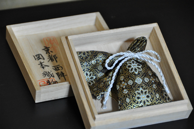 パッケージを一新しました。匂い袋もご覧ください。大事な方への贈り物にぴったりだと思います。正絹と本金箔の織り込まれた小さな宝物を。