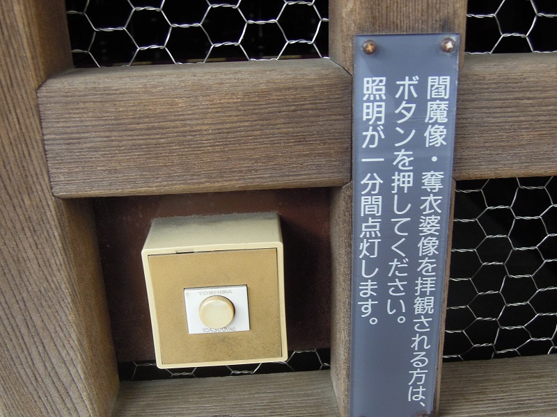 閻魔堂・奪衣婆像を拝観される方は、ボタンを押してください。照明が一分間点灯します。
