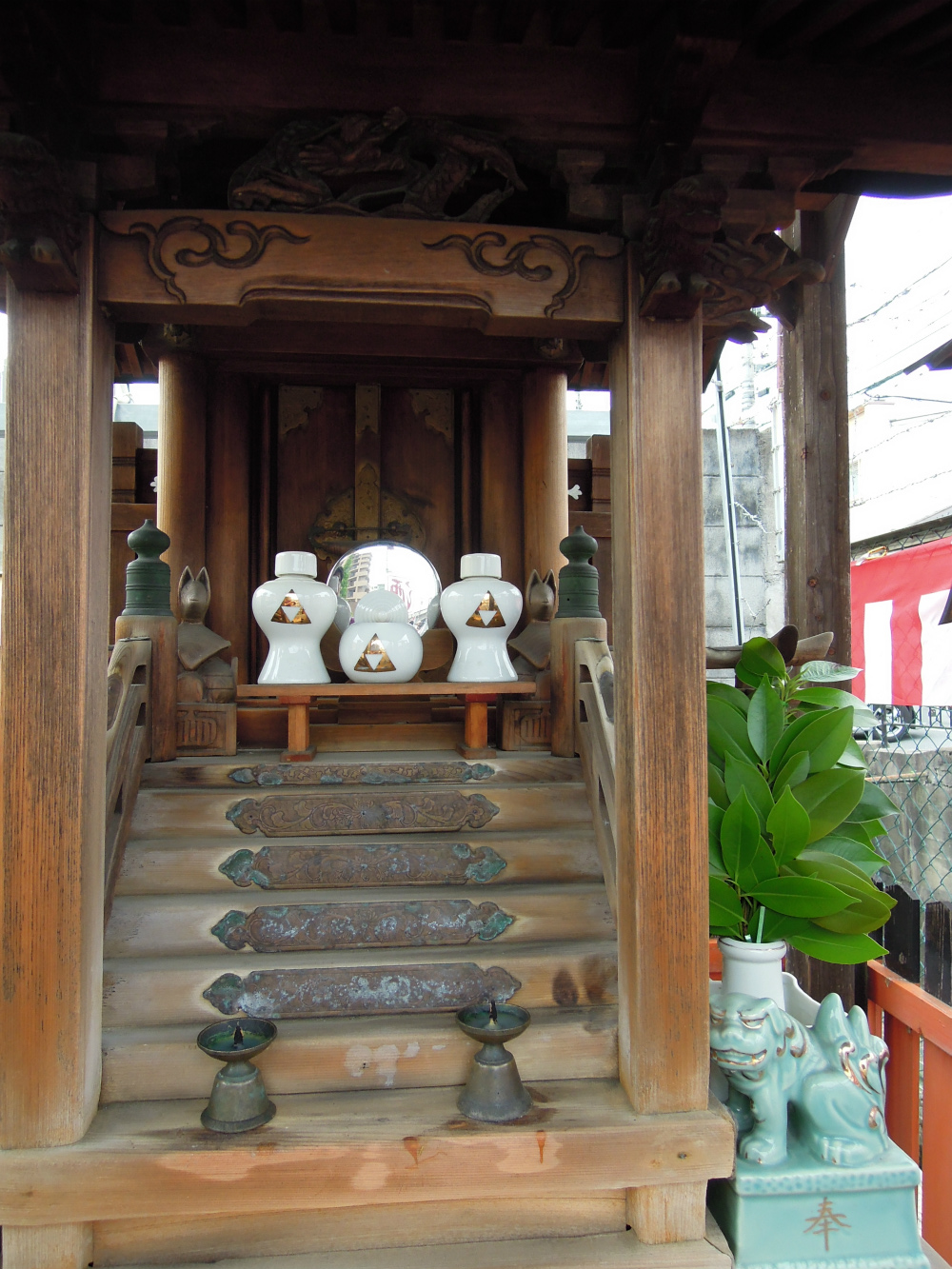 鏡もぴかぴかです。クローズアップするとよう見えますね。お狐様がいはります。お稲荷さんですね。やはり、商売繁盛。