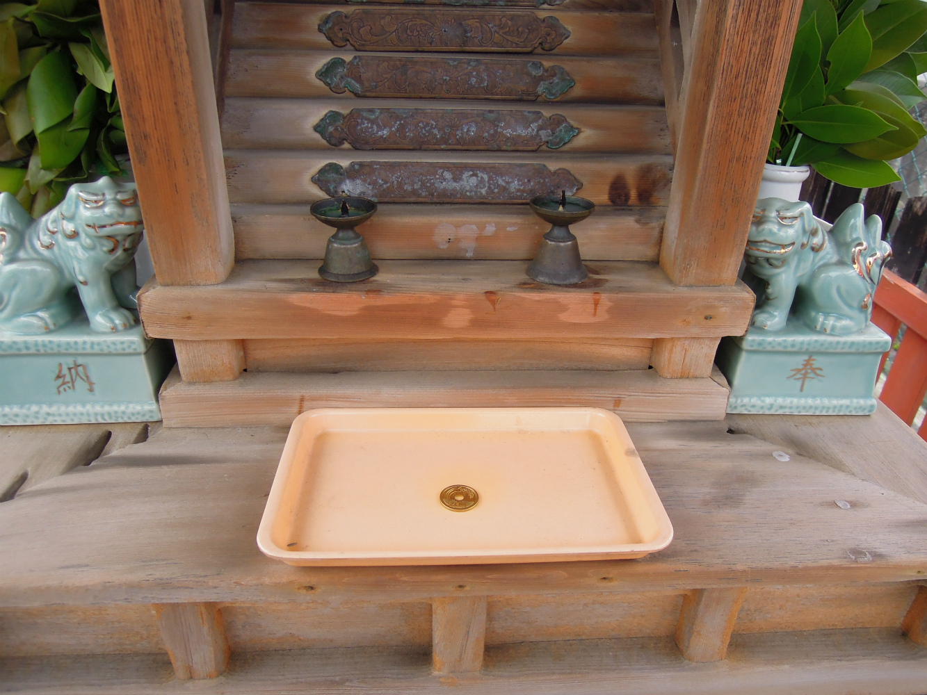 5円がお供えしてありました。「ご縁がありますように」。場所的に商売繁盛を祈っていると思われますので「商売繁盛とご縁がありますように」ですね。