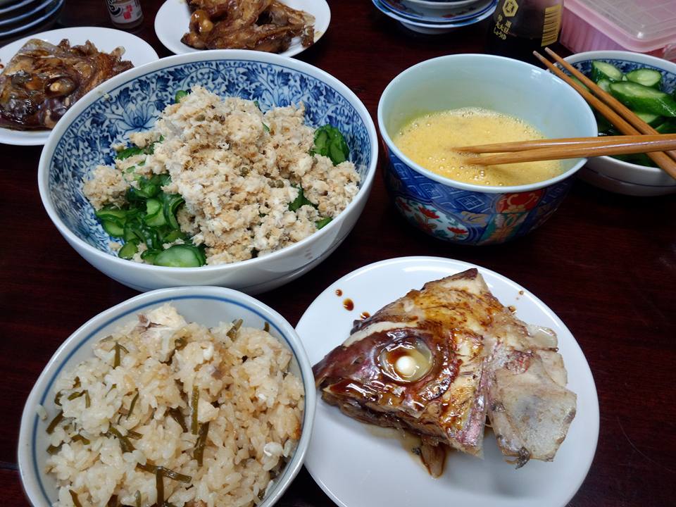今日の織屋のまかないは鯛尽くし。鯛のアラ炊き、鯛と昆布の炊き込みご飯実山椒と生姜風味、鯛のそぼろときゅうりもみ和え。等々。