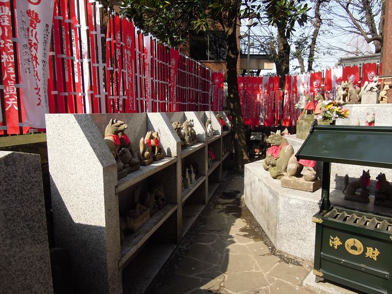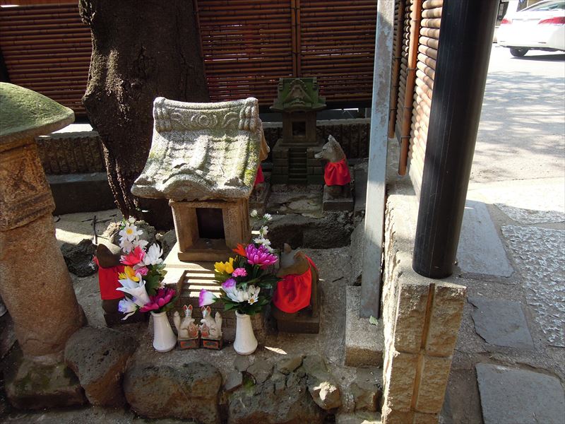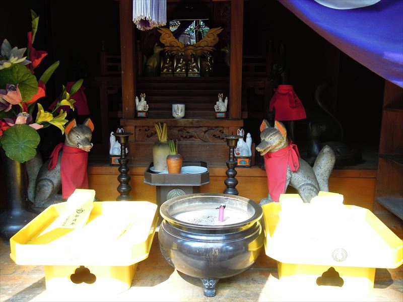 ↑三神殿。右には健康を守る太郎稲荷、中央には繁栄を司るといわれる宇賀神王、左には円満な対人関係をもたらしてくれる徳七郎稲荷が祀られています。