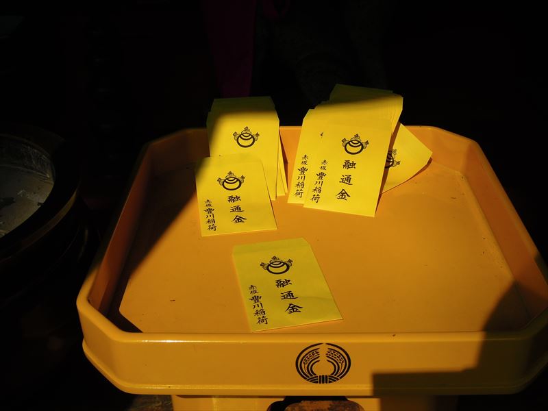 ↑融通稲荷。黄色い紙袋に10円が入った「融通金」を自由に持ち帰り1年後、または願が適った時に利子を付けて返納するという変わったお稲荷さん。開運招福、金銀財宝の融通を叶えられるといわれています。