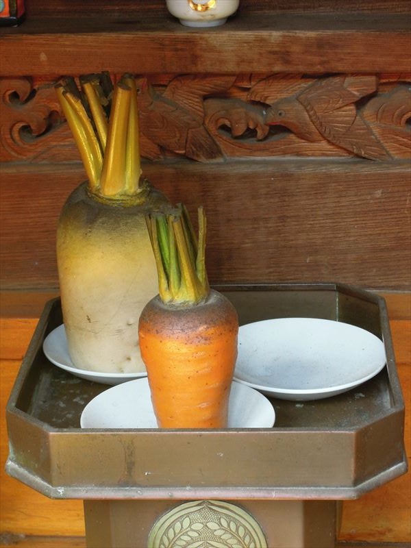 かわったお供物だなと思ったらレプリカの野菜でした。でも奉納するときにこのように切るようです。