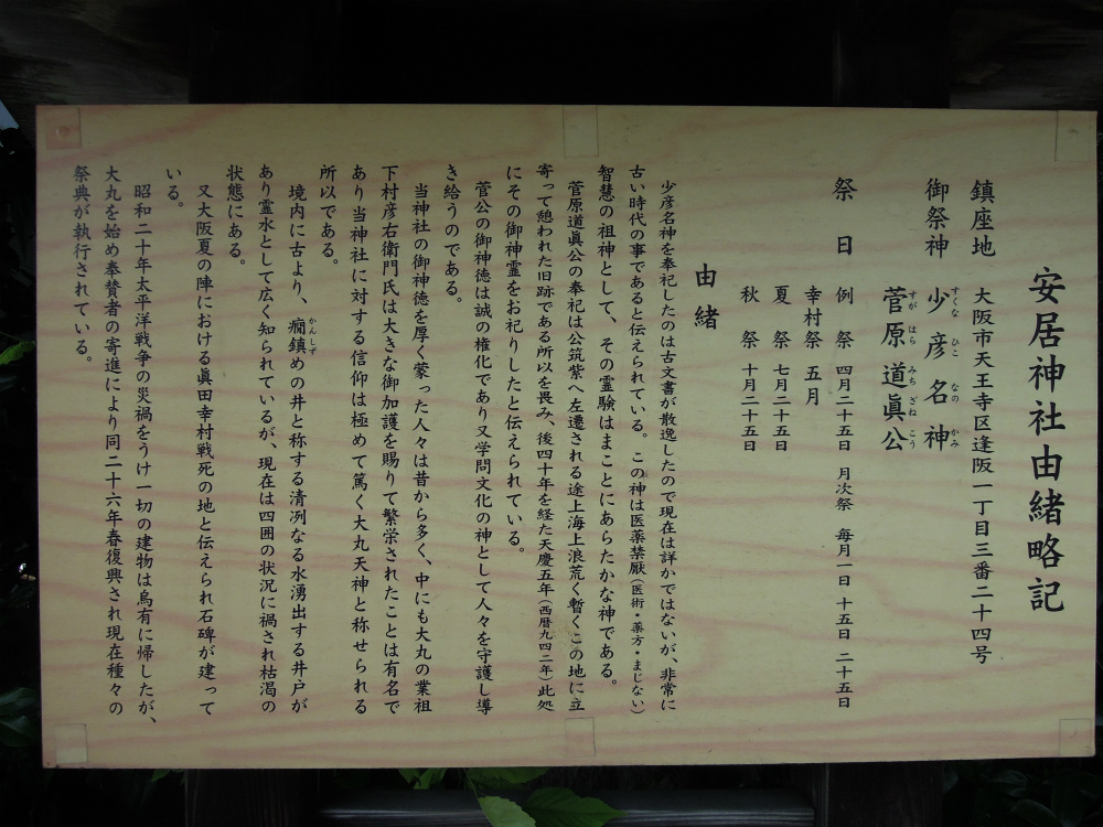 御祭神は少彦名神と菅原道真。菅原道真が大宰府へ流刑される時に、道真が休んだから「安居」という名がついたという伝承があるそうです。天王寺三名水の一つで「癇沈めの井」という冷水の出る井戸があることから「安井」と言われたとか。しかし残念ながら今は枯渇状態だそう。