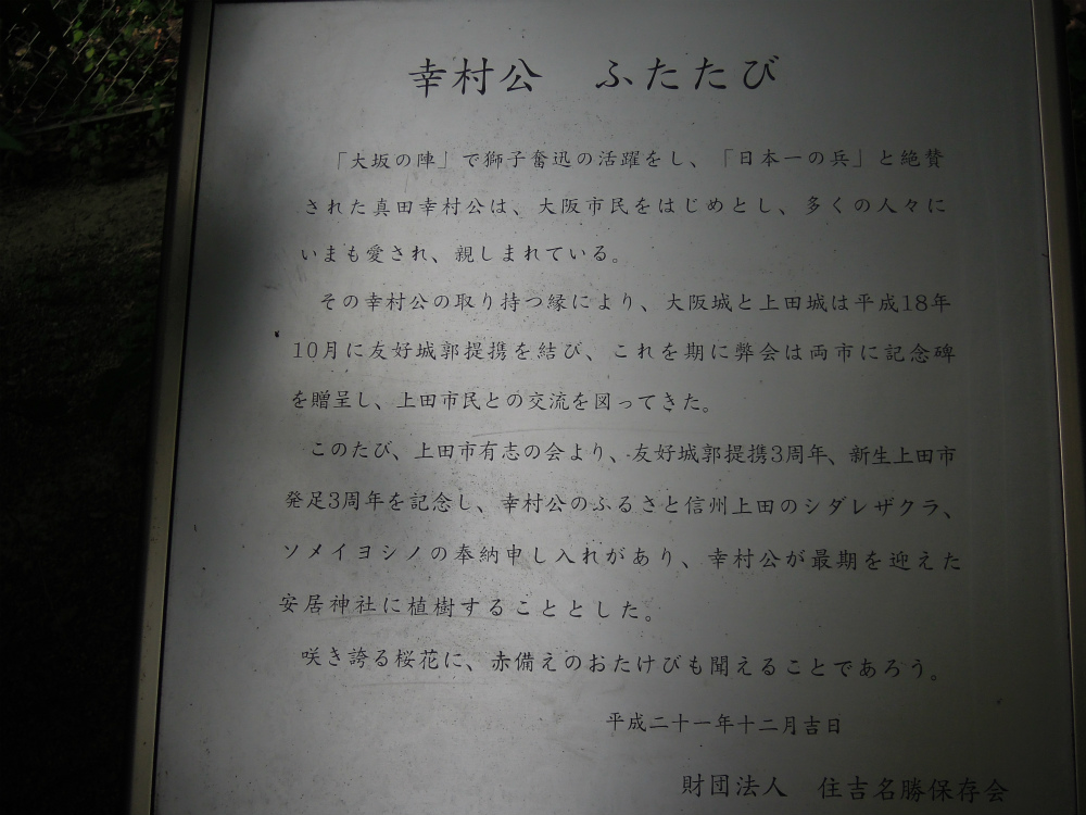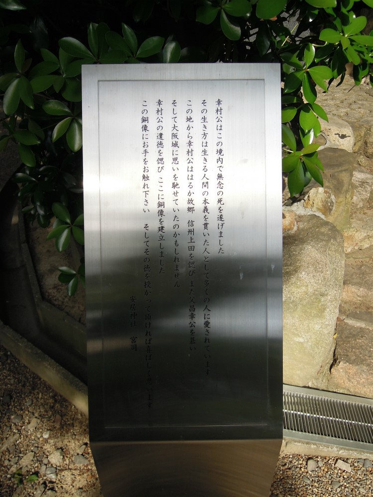 幸村公はこの境内で無念の死を遂げました。その生き方は生きる人間の本義を貫いた人として多くの人に愛されこの地から幸村公ははるか故郷 信州上田を偲びまた父、昌幸公を慕いそして大阪城に思いを馳せていたのかもしれません。幸村公の遺憾を偲び、ここに銅像を建立しました。この銅像にお手をお触れください。そしてその徳を授かってください。と書いてあります。