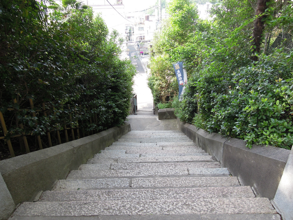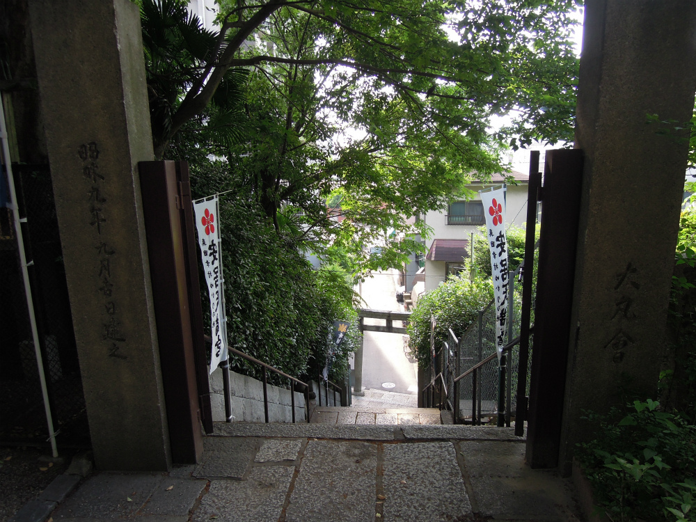 南の四天王寺側の鳥居から入り、北側の道から出るとします。結構急でしょう。坂の多い街です。昭和9年の鳥居が残っていますがこれも戦火にあってるんでしょう。